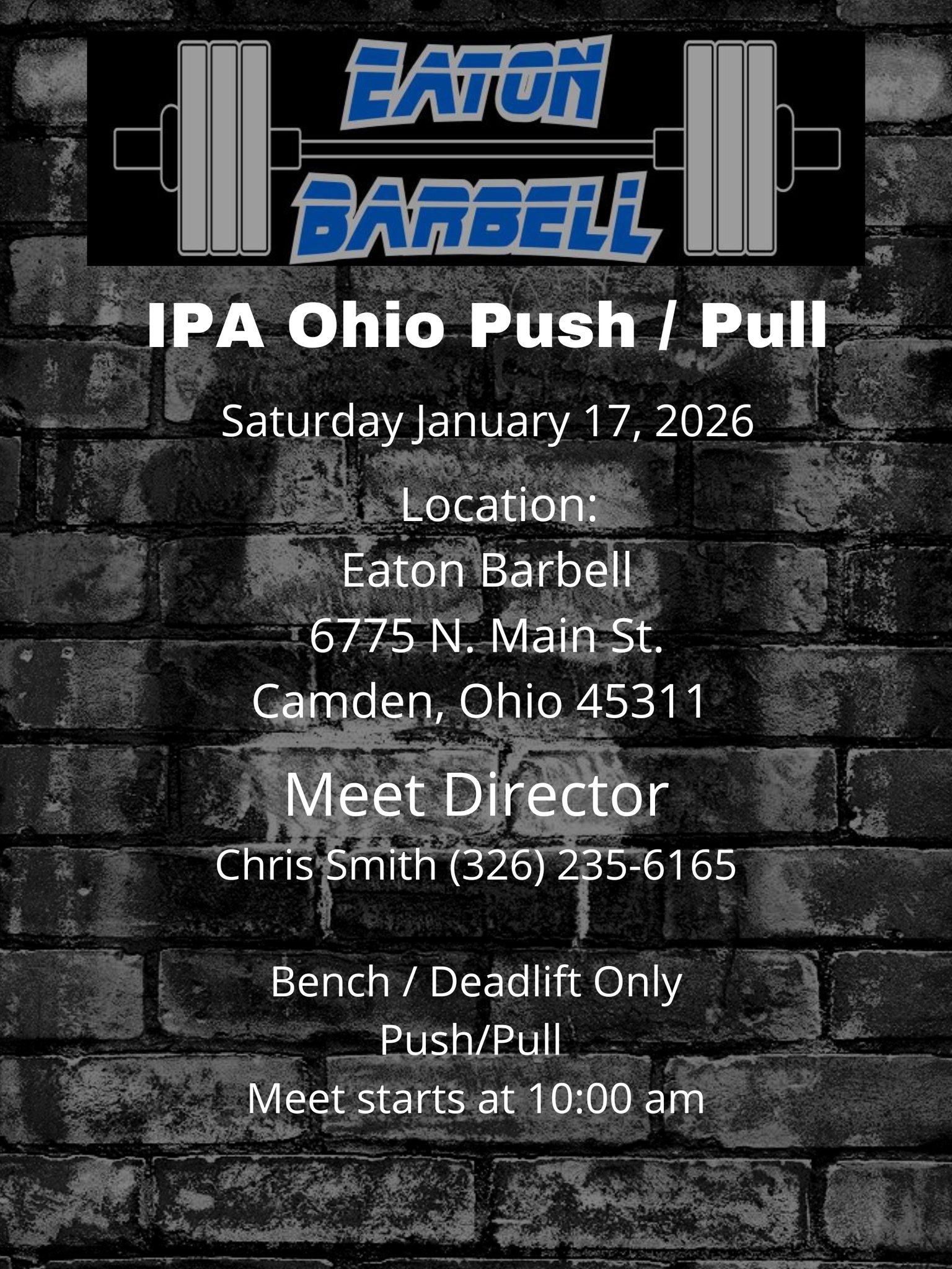 Meet Director: Chris Smith, (326) 235-6165, eatonbarbellohio@gmail.com